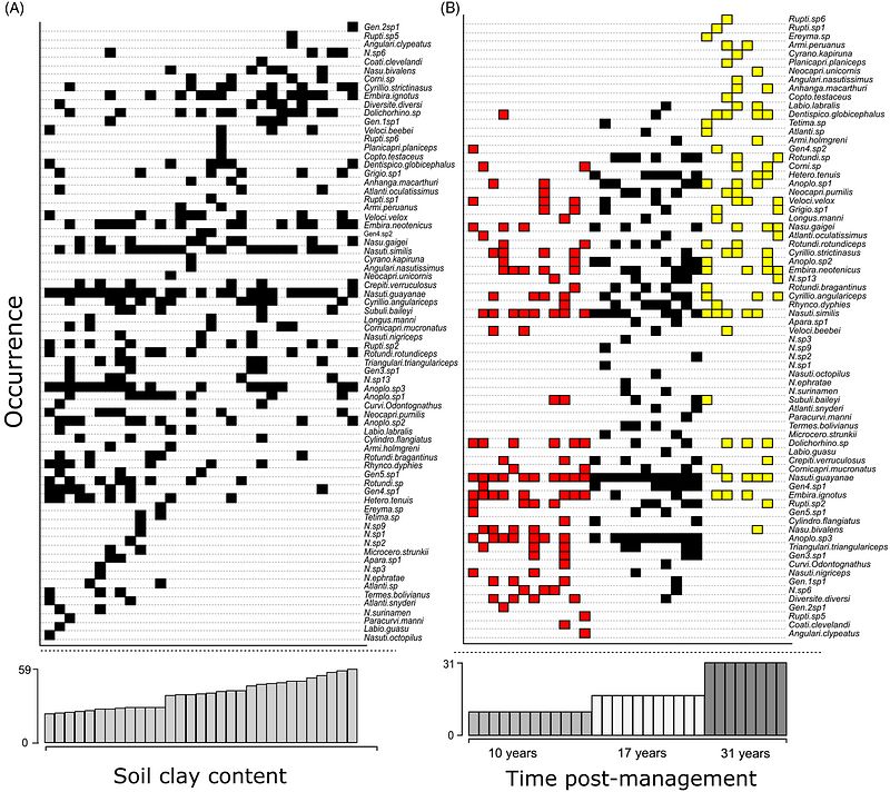 Presence and absence of each termite species along the soil clay content gradient (A) and time post-management (red: 10, black: 17, yellow: 31) (B).