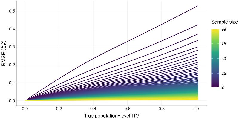 Influence of sample size and true population-level ITV on the root mean square error (RMSE) of the population-level ITV estimate (CV^) for in silico populations.
