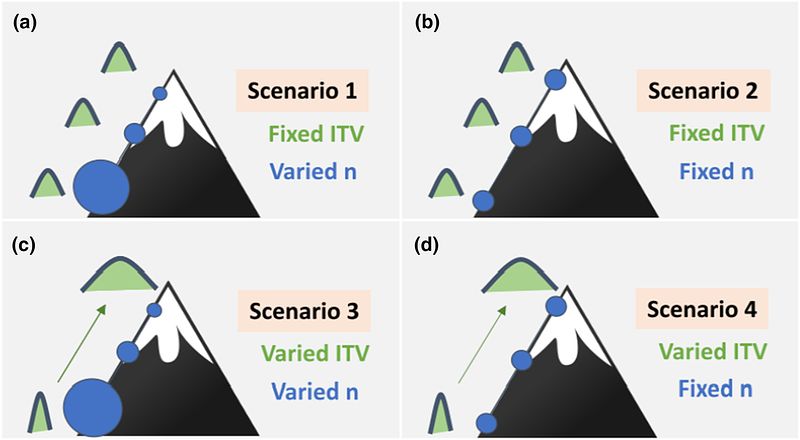 Schematic illustration representing the four simulation Scenarios where the mountain (i.e., elevation) represents an environmental gradient, the blue circles represent the sample size and the green parabolas represent the intraspecific trait variation (ITV) of the in silico populations.